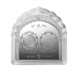 The 50 g Sukh Samridhi silver coin is designed to bring good luck to your home. The coin has Goddess Lakshmi minted on it, with her four arms that together represent perfection and freedom from limitations. Along with Goddess Lakshmi, we have Lord Ganesha bestowing his blessings of prosperity upon the devotees. Lord Ganesha is particularly relied upon for His power to remove obstacles from the paths of humankind.