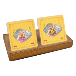 This symbolically rich 999.9 purest silver pair of stylised coins are precision-minted with finely etched portrayals of Lakshmi and Ganesha on first-of-its-kind Shankh design. Together Lakshmi and Ganesh symbolise auspiciousness, and prosperity. Each pair of coin is secured within a custom made capsule which also helps you display the product, while the MMTC-PAMP’s stamp of authenticity serves as your assurance of the highest purity and finest craftsmanship available in the world. Each silver stylized coin weighs 25 gm, and comes with the promise of positive weight tolerance which gives you the guarantee that every piece of gold or silver that you buy from MMTC-PAMP will weigh more than what is mentioned on the pack. Always.