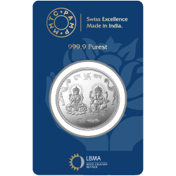 Get the beautiful and auspicious Ganesh Lakshmi 10g pure silver coin to bring home purest blessings from these venerated deities from Hindu mythology. As the divine incarnation of physical beauty, fertility, luxury, and prosperity, Goddess Lakshmi is portrayed with her four arms that together represent Cosmic Omnipotence, as well as perfection and freedom from limitations. MMTC-PAMP 10g Lakshmi Ganesh silver coin is in 999.9 Purity. We see two hands hold the Lotus flowers, reflecting beauty, perfection, and rebirth, while another offers coins as an affirmation of enduring wealth, and finally, one open palm assures safety and protection. Lord Ganesha bestows blessings of prosperity upon his devotees, but also, represents his power to remove obstacles from the paths of humankind.